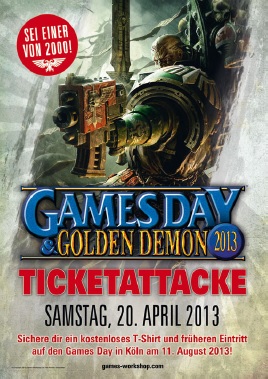 Leute, sichert euch schnell noch die Tickets. Den aktuellen Gerüchten nach soll eine Woche vor dem deutschen Games Day von den 2000 Tickets nur noch ein winziger Restbestand von etwa 1200 Tickets zu haben sein.